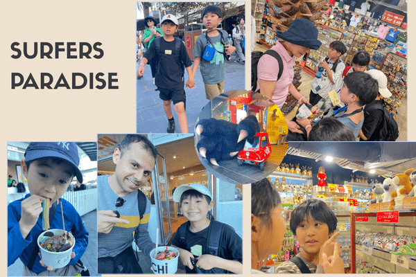 今日のお題は「Surfers Paradiseで遊ぶ」。ゴールドコーストの有名な観光地の1つ、サーファーが集まるメッカですね。有名なビーチに隣接して渋谷や原宿のような雰囲気のShopsが並びます。学校からチャーターバスで連れて行ってもらいました。「自分でパートナーを見つけBuddyを作って歩く、一緒に行動する」がお約束。外に出るときは真剣勝負。事故があっては大変ですからね。バスで15分のSurfers Paradise、前半は街を散策、後半はビーチ遊び。16時半まで自由に動きます。UPBEATを引率するのはSabel先生、有名なシャーベット屋さんに連れて行ってくれました。シャーベットを自分で作るハンドメイドスイーツ屋さんですがすっごい作品ができちゃいました。写真を見てね(笑)。